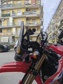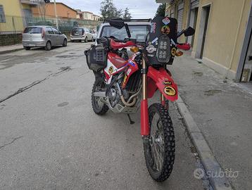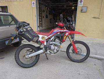 Cedo Honda CRF 300 L, giugno 2021. La moto è perfettamente funzionante in ogni sua parte. Manutenzione certosina, motore originale senza nessuna modifica. Accessoriata con torretta rally più set R40 MOSKOMOTO, filtro aria lavabile DNA. Trittico DID sostituito 3 mesi fa. Gomme al 50%. La cedo così come in foto, in versione rally adventure con torretta rally e set moskomoto r40, al prezzo indicato. Con faro originale e senza borse Mosko, il prezzo è trattabile.