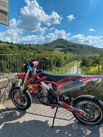 La moto attualmente monta cerchi motard originali Hm , freno anteriore maggiorato, radiatore maggiorati , scarico originale e altri 2 di qui uno sempre originale hm e un arrow in titanio da sistemare , doppi cerchi enduro e motard.