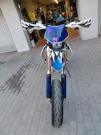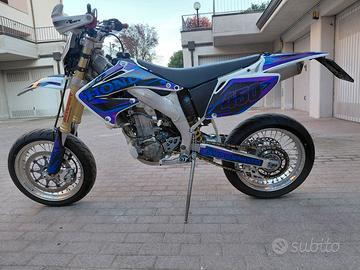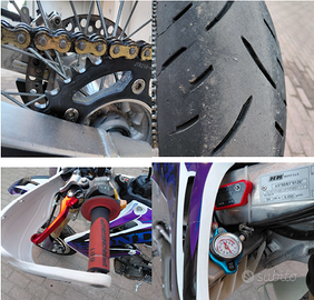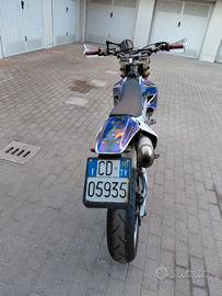Per passaggio a moto di categoria superiore vendo Honda CRF 450 motard del 2005. Moto particolarmente divertente da usare è in ottime condizioni. Il motore è stato revisionato ed ha all’attivo poco meno di 140 ore, il carburatore è stato sostituito e ha poco meno di 50 ore. Moto regolarmente tagliandata ogni 25 ore. Catena corona e pignone praticamente nuovi. Monta gomme Dunlop sportmax GPR-300: la posteriore è appena stata cambiata e l'anteriore è al 70%. Leve freno e frizione in ergal e termometro sul tappo del radiatore. A libretto doppia omologazione per la ruota posteriore 150/160. La moto può essere guidata con patente A2, ed è omologata per 2 persone. La revisione scade ad Aprile 2028 Prezzo leggermente trattabile.