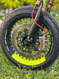 - insieme all'impianto frenante sono state tarate le sospensioni per l'utilizzo motard (le forcelle anteriori sono anche state ribassate) e sull'avantreno sono stati montati: