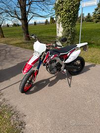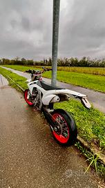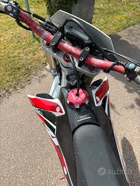 Come da titiolo vendo honda crf 450 r del 2016. Targata, omologata motard a libretto, guidabile con a2, vendo con due coppie di cerchi motard, sono due rossi e due neri, quelli rossi sono originali husqvarna ma montano anche su honda, gli altri due sono compasti da alpina tubless con gomme nuove MAI USATE, motore ha attualmente 196,5 ma a 153 e stato rifatto tutto, tagliandi eseguiti ogni 12,5 ore, l’ultimo eseguito 2 ore fa, ma poi lasciata ferma per circa 4 mesi a causa della revisioni forcelle, forcelle preparate da lanci, poi ci sono svariati pezzi : da plastiche a paramotore in alluminio a copri forcelle in carbonio ( non presenti in foto ), una chicca é il rinforzo per il codino posteriore in carbonio che permette di togliere il semitelaio cosi da essere piu leggere e manovrabile. Prezzo trattabile