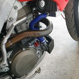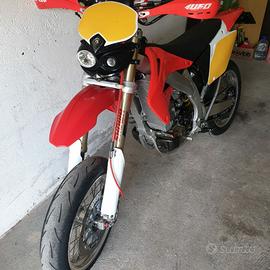 Hm crf 450 r 2004 TARGATA, moto usata veramente poco, in totale avra 80 ore. Moto immacolata, MAI pista, Mai enduro. Tutto funzionante fari frecce stop. Moto non pastroccata con cinesate ecc ecc. Nessun tipo di problema. Usata solamente qualche volta l estate col sole. Pistone rifatto. Quest' inverno l ho totalmente aggiornata con parti NUOVE e quest estate l ho usata 2 volte; PARTI NUOVE; Scarico completo scalvini Mono e forche completamente rifatte e abbassate tarate motard Impianto frenante radiale Brembo(pinza e pompa 16x18) Radiatori maggiorati gpi. Tubi siliconici SAMCO. Gomme Metzeler k2 anteriore k3 posteriore. Corona,catena e pignone nuovi. Olio motore cambiato ad ogni uscita. Olio cambio nuovo. La consegno tagliandata e con revisione fatta. Moto pronta da usare,perfetta. Un missile. Vendo per un progetto.