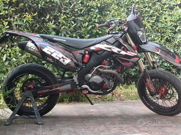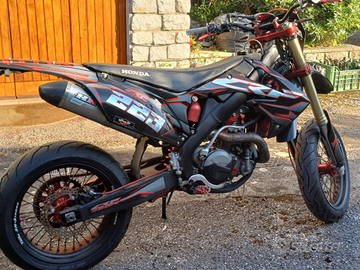 Moto a piena potenza ma depotenziata a libretto, omologata per 2 persone e con tripla omologazione (motard, enduro, cross).