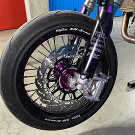 Vendo per mancanza di tempo e lavoro fuori regione. Mai pista motard o cross. MOTO REVISIONATA Moto in ottime condizioni, usata raramente per qualche giro occasionale. Tagliandi ogni 8h con Motul 300V. Dispone della tripla omologazione cross/enduro/motard, passegero e “depotenziata “A2. La moto viene venduta in due configurazioni: cross e supermotard. Monta: •Piastre KITE SM 200 con risers dedicati e manubrio da 28 •Perno anteriore VM •Cerchi FABA personalizzati su misura •Gomme Continental ContiAttack SM EVO 95% •Gomme Cross dunlop al 85% •Pinza Brembo Triple Bridge con pastiglie seminuove + pastiglie nuove di ricambio •Tubi freno in treccia aeronautica Accossato •Pompa freno radiale Accossato 16x18 nuova •Sposta pinza VM •Impianto elettrico VM plug and play •Mascherina VFace nuova con Angel Eye •Disco anteriore 320 Motomaster Flame nuovo •Disco freno posteriore nuovo + pastiglie nuove •Mono e forcelle (kyb 48)rifatte da Odorizzi Motosport •Frizione rinforzata + molle rinforzate •Frizione antisaltellamento STM (in aggiunta) •Centralina JD Dual Map • Tre KIT DI PLASTICHE DI CUI UNO NUOVO+Grafiche • SELLA RIFATTA ( materiale duro usato nelle gare di MX) E RIFODERATA CON AGGIUNTA DI GRIP by wd racing Gioco valvole ogni 30h. Blocco motore con circa 81h (possibile lieve incremento). Viene ceduta con tutti i ricambi originali. Disponibile PDF con lista completa accessori, ricevute e foto dei lavori eseguiti. Moto pronta all’uso, nessun lavoro da fare. Ottima anche come base pista. Prezzo 7.400€ TRATTABILI !!!!!!! No perditempo. NO scambi ho già un altro 450 solo uso pista !