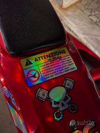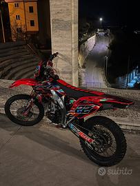 la moto ha 133 ore,a 119.3 ore è stata portata a telaio e curata nei minimi dettagli,dal motore alla ciclistica,è stato revisionato completamente il carburatore e tutto l'impianto elettrico compreso lo statore nuovo.Tagliando eseguito ogni 9/10h con olio motul 7100 dimostrabile,bobina nuova,candela nuova NGK IF8H11,filtro aria nuovo,gioco valvole appena effettuato,collettore e terminale puliti internamente e terminale riverniciato ed è stata cambiata la lana di vetro,come nuovo.Esteticamente è perfetta,grafiche personalizzate olografiche dal valore di 350?,telaio lucidato a specchio e protezione in pellicola carbonio,tubi sfiato carburatore e tubi radiatori nuovi,pedane e leve freno/frizione anti rottura rosse,tappi olio ergal rossi,distanziali ruote in ergal rossi,coperchi liquido freni in ergal rossi,paraspruzzi nuovo,luce posteriore led,portatarga pieghevole gtlab,frecce nanoled,faro posteriore led,mascherina v-face con faro led angel eye RED,paracolpi scar,manopole protaper,cerchio anteriore FABA. Insieme alla moto cedo due kit di cerchi,uno con semitassellate mitas,l'altro con tassellate metzeler con mousse.Kit trasmissione muovo (corona,catena,pignone 15dt).Moto curata nei minimi dettagli e lavata dopo ogni uscita,sempre tenuta in casa.