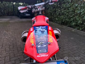 Attualmente è in versione motard e monta cerchioni faba, paramani acerbis, impianto elettrico completo appena fatto e perfettamente funzionante ,infine monta doppio scarico pro circuit aperto.