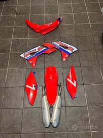 Insieme alla moto e compreso nel prezzo cedo, come visionabili in foto, cerchioni cross, doppio kit di plastiche lucas oil e scarichi originali.
