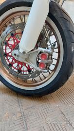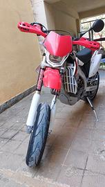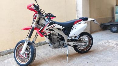 Honda crf 450x supermotard La moto è ORIGINALE MOTARD (non una enduro trasformata). Versione a CARBURATORE (maggior prontezza e accelerazione, rispetto alla versione ad iniezione). Scarico Leovince X3 Albero a camme profilo racing Versione omologata per due persone perciò con: bloccasterzo chiave quadro pedane passeggero sella confort + sella racing. Pinza radiale a doppio pistoncino con disco flottante da 320mm, tubo freno in treccia e pompa radiale. Sospensioni motard. Cerchi a raggi da 17" bicolore(bronzo + silver) originali HM. Avviamento elettrico. Avviamento a pedale. Olio separato (motore/cambio). Raffreddamento con vaso di espansione.