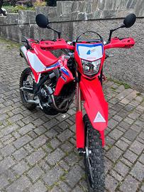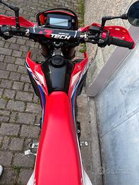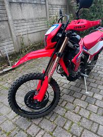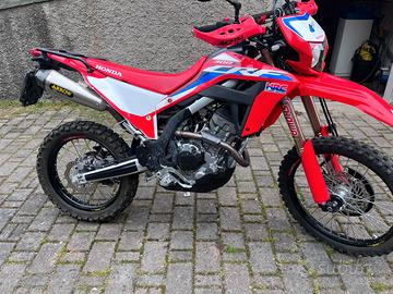 56 enne vende Honda Crf300L immatricolata 2/2022, km 10.000 appena fatti, usata escusivamente per eventi adventuring come la 1000 Sassi, ecc. Acquistata usata a 4.000Km, sono il secondo proprietario. Cambiato olio+filtro per mio scrupolo a 5.000Km e poi ora a 10.000Km, tagliando ufficiale sarebbe da fare a 12.000Km. Gomme : al momento monta anteriore Michelin Tracker 40% + camera Camera rinforzate ultra heavy duty 4,5mm, posteriore originale IRC al 50% con camera originale (messa per la revisione), cedo altra anteriore originale al 50%. La moto è perfetta e superaccessoriata con oltre 2500 euro di accessori quali: -Mono posteriore Ohlins (1000 euro solo lui) -Sospensioni anteriori con cartucce Andreani Misano regolabili (500 euro) -Collettore + terminale Arrow X-kone omologato (600 euro) -Paramotore Acerbis Nero nuovo appena montato (60 euro) -Protezione telaio -Protezione pompa freno posteriore -Protezione disco anteriore -Portapacchi Givi (60 euro) -Filtro aria Twinair in spugna oliata (ho anche originale in carta) (40 euro) -Frecce a led -Cavalletto dedicato in alluminio con inclinazione regolabile (50 euro) -Manubrio in ergal nero Racetech (60 euro) -Manopole Progrip Rally in spugna -Paramani acerbis chiusi -Accessori in alluminio vari...che non mi ricordo Dispongo di tutte la parti originali (manubrio, frecce, portatarga, frecce grosse, terminale e collettore, mono e cartucce sospensioni originali, cavalletto, ecc). Revisione appena fatta a marzo 2026, bollo appena pagato per 1 anno. Vendo solo per passaggio a moto diversa: il CRF300L è molto facile, leggera e divertente oltre che affidabile, molto parca nei consumi ed economica. Qualora di statura inferiore alla media, dispongo del link leveraggio per poter abbassare altezza del posteriore di 2-4cm mai utilizzato. Così com’e è pronta per iscrizione a qualsiasi evento, basta metterci il proprio navigatore e la benzina!
