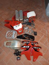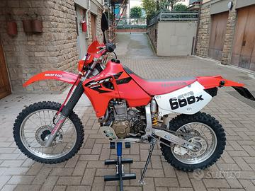 Per raggiunti limiti di età (miei, non della moto), vendo XR650r, 2008 (tra le ultime immatricolate, Euro 2). All'attuale monta radiatori maggiorati + ventola con termostato, collettori scarico maggiorati, faro america, manubrio conico, strumentazione digitale, paracoppa alluminio, grafiche rifatte (prima foto). Perfetta, appena tagliandata, avviamento kick starter, parte al primo colpo. Cedo anche in blocco (solo con la moto): altri radiatori e collettori originali, ulteriori 2 mascherine, una originale, e 3 fari, altro serbatoio, parafango anteriore, portatarga originale e portapacchi, pedane posteriori, paramotore, frecce e stumentazione originali (sono circa 1.500 euro di pezzi in più). Astenersi per favore truffatori e furbi. Scambio solo con Honda XR 450 dal 2020 in poi con conguaglio da parte mia.