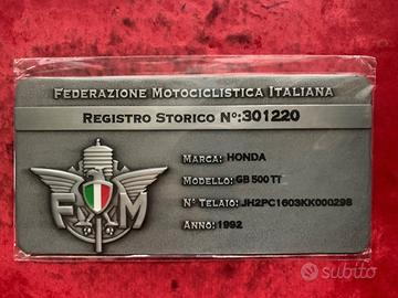 La moto è provvista di documento FMI (CRS - Certificato di Rilevanza Storica per re -immatricolazione italiana) e targhetta metallica e quindi è pronta per essere targata italiana, come veicolo storico con assicurazione e bollo ridotti.