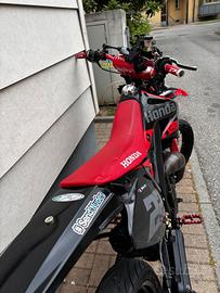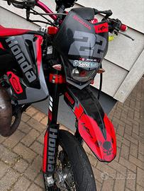 Come da titolo vendo Hm 50 motard in ottime condizioni con sotto elaborazione molto performante ma sempre mantenendo la moto nella massima affidabilità. La moto monta: Maxi kit tpr86 lavorato Albero top corsa 44 Pacco lamellare top abbinato a carburatore phbl25 Frizione rinforzata top Carter lavorati + tutti i cuscinetti nuovi. Scarico completo katrace calcolato 80-90 Pompa acqua maggiorata stage6 + secondo radiatore e dissipatore di temperatura. Forcelle da poco revisionate. Impianto frenante anteriore maggiorato con pompa freni adelin radiale. Esteticamente ha grafiche personalizzate, diversi pezzi in ergal rosso, mascherina vface con angel eyes e svariate altre cose. Moto che ho usato poco ma sempre mantenuta con cura e da quando la posseggo non mi ha mai dato alcun problema. No perditempo grazie. Possibilità di trasporto previo visione e accordi.