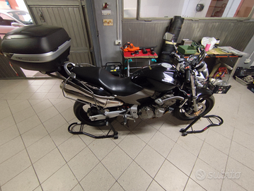 Honda Hornet 600 anno 2003, km 42.580, perfetta, gommata al 90% (2024), mono ammortizzatore sostituito (2024), forcelle anteriori revisionate, candele nuove iridium, tagliando eseguito, filtro sportivo e filtro originale, catena, corona, pignone sostituiti circa 4k km fa, bauletto Givi V56N/NT installato nella primavera 2025, borsa da serbatoio Givi, borse laterali Givi con telaietti, cavalletti di supporto per i periodi di inutilizzo, vendo ad euro 1400 causa passaggio a maxi enduro. Nel blocco cedo anche 3 filtri olio, lampadine varie di ricambio, un cavo ed una leva frizione di scorta, supporto smartphone, doppia USB installata su manubrio, e presa per mantenitore di carica già installata La moto si presenta con un piccolissimo segno sul bauletto dovuto a mia sbadataggine e un piccolo graffio sul carter destro già presente da quando l'ho acquistata. Per il resto è stata tenuta in maniera quasi maniacale, prezzo non trattabile. Passaggio a carico dell'acquirente .
