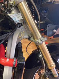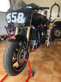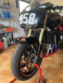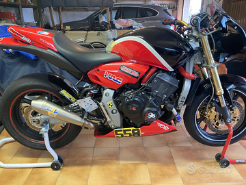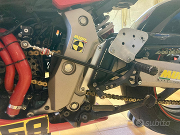 Monta scarico completo Leovince, filtro aria sportivo, forcella e mono Mupo, ammortizzatore di sterzo Matris, frizione antisaltellamento STM, centralina aggiuntiva, cambio elettronico ed esclusore limitatore della sesta, pedane Valtermoto (cambio rovesciato), manubrio Accossato (più uno di riserva), tubi freno in treccia e pastiglie ZCOO, doppi cerchi con dischi freno, motore di riserva (entrambi sono stock).