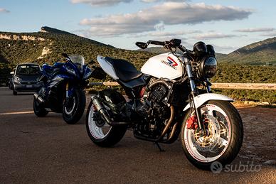 Vendo Honda Hornet 600 del 2003, di cui della moto originale non ha più nulla. È stato effettuato un restauro/ customizzazione totale che ha compreso: Verniciatura telaio Sostituzione e verniciatura motore Revisione carburatori Pastiglie nuove Revisione e indurimento forcella anteriore Verniciatura di tutte le parti di color nero Verniciatura carene e serbatoio Radiatore nuovo Modifica faro a led (estremamente potente) Sella rifoderata Scarico basso SC project 60mm Tanti accessori come tamponi, manopole, specchietti e altro Gomme in ottimo stato Tagliandata recentemente ma verrà Fornito un ulteriore kit tagliando Nell’ultimo anno è stata usata pochissimo, condizioni maniacali, nessun lavoro da fare. Valuto vendita per cambio tipologia No Perditempo No scambi