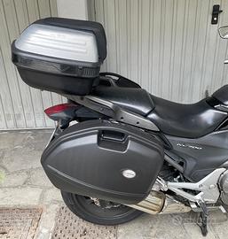 Le valigie contengono tranquillamente un casco integrale ciascuna, così come anche il comodo pozzetto anteriore riportato in foto. Il bauletto può contenere due caschi integrali.