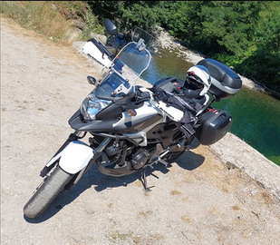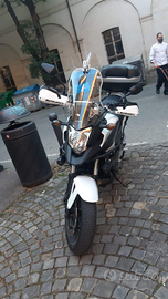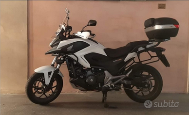Motociclo Honda NC750X di colore bianco perlato e nero, in perfette condizioni. Sempre tagliandata presso concessionaria Honda. Sempre custodita in garage. Borse laterali e posteriori. Copertura in plastica nonché foderata. Pneumatici nuovi, sostituiti da pochissimo sempre presso concessionaria Honda. Revisione effettuata da poco. Pomelli laterali para cadute. Fanali supplementari anteriori e paramani (montati presso concessionaria Honda). Cupolino (parabrezza) di 2 misure (modello basso e modello alto). Sellino originale ma reso più confortevole per i lunghi viaggi. Cavalletto laterale e centrale. Carrellino per parcheggiare e spostare la moto all'interno di spazi ristretti Consumi ridottissimi. Moto spettacolare.