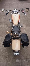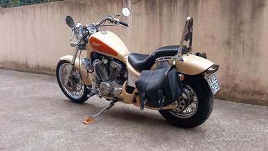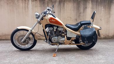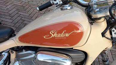 Honda shadow VT600 c prima serie del 1992, colore originale, 4 marce. Doppia chiave. Meccanica rimessa a nuovo circa 2500 km fa con revisione completa dei carburatori (guarnizioni, membrane e manicotti), rubinetto benzina, revisione forcelle, revisione monoammortizzatore, pneumatici, catena corona e pignone, termostato, bulbo e liquido refrigerante, tagliando completo di olio filtri e candele, cavo frizione nuovo e valvole registrate. Completa di sissy bar e borse laterali. Insieme vendo anche i fianchetti originali in tinta.