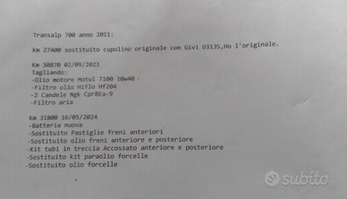 Vendo Honda Transalp XL 700 V del 2011 con 38.000 km per cambio tipologia. Moto tenuta maniacalmente. In omaggio bauletto Givi e cupolino (attualmente montato) più protettivo. Fornisco anche cupolino originale. Prezzo pochissimo trattabile solo dopo visione.