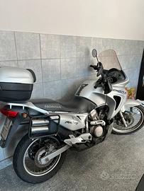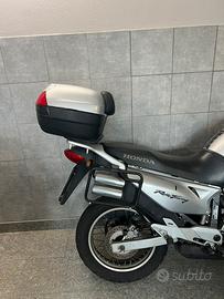 Honda Transalp del 2003, modello XL 650 V, (Montesa-Honda), completa di bauletto e di borse rigide laterali originali. Enduro stradale affidabile e versatile, con standard qualitativi elevati. Equipaggiata con un motore bicilindrico a V di 52° a 4 tempi, con una potenza di 39 kW (53 CV) a 7.500 giri/min, frizione multidisco in bagno d'olio, accensione elettronica CDI.