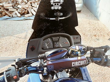 Cupolino Goffi racing con staffa per telefono/navigatore, terminale Marwing, manubrio, specchietti e paramani enduro. Telaio paramotore, telaietto per bauletto givi, faretti led supplementari, presa USB, presa per mantenitore di carica batteria, cerchi oro.