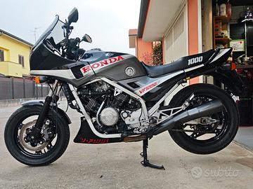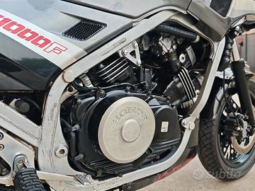 Splendido esemplare di HONDA VF 1000 F Interceptor del 1984 completamente restaurato in ogni sua parte con 40.000 km. La sorella maggiore della iconica VF 750 che correva nel campionato AMA SBK negli anni 80" Il modello in vendita grazie ai suoi 116 CV e un motore V4 da 1000cc regala emozioni uniche e decisamente uniche per una moto di quei tempi. La moto è regolarmente registrata FMI con targa oro (interesse storico) ottimo investimento soprattutto per gli anni a venire. La moto è stata rivista in ogni sua parte: -sospensioni revisionate -pinze freno revisionate -tubi in treccia Hel wel -pastiglie Brembo -gomme Bridgestone BT 46 nuove -carburatori revisionati totalmente -Serbatoio completamente revisionato -batteria Motobatt -regolatore di tensione -solenoide avviamento -cupolino GIVI -pompe freno revisionate, -leve freno in ergal regolabili -Filtro aria nuovo -motorino avviamento -bobine -sella E molto altro dimostrabile con ricevuta. Al prezzo di 3.500 euro -Al prezzo di 4.500 Euro invece viene fornito il seguente materiale: insieme alla moto viene ceduto un secondo motore ad uso ricambi in caso di necessità, Monoammortizzatore YSS completamente regolabile e molle progressive Hyper pro per la forcella anteriore (materiale ancora imballato) Fatture disponibili di tutto il materiale acquistato, foto e video dei lavori effettuati SU RICHIESTA.