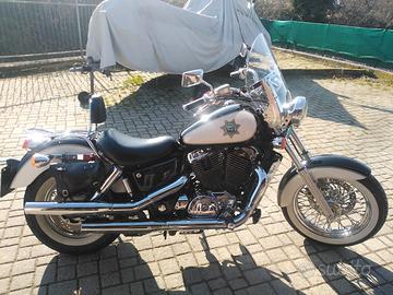 Moto perfetta , accessoriata con borsa e borsello laterale in pelle , parabrezza e proteggi radiatore originale . In aggiunta poggia schiena con portapacchi e scarichi aperti nuovi mai montati