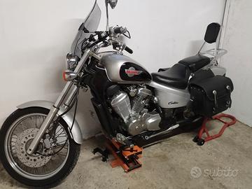 Honda Vt 600 Shadow 4 marce. Anno 1994 50900km, Carrozzeria senza graffi, Tutta originale , tagliandata. Sono stati fatti i seguenti lavori di manutenzione ordinaria: Olio+ filtro, filtro aria, 4 candele, liquido radiatore, liquido freno a disco, pulizia e allineamento carburatori, revisione e olio forcelle, motorino avviamento, batteria, camere aria e pneumatici Dunlop. Accessoriata di schienalino, borse, parabrezza. Caricabatteria. Revisionata fino a Giugno 2027.