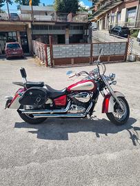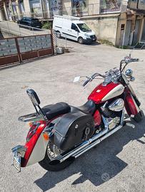 Moto Honda Shadow 750 cc. accessoriata con borse laterali rigide, schienalino GIVI, puntale parafango anteriore, manopole rider, poggiapiedi con croce celtica. tagliandata. Cambio recentissimo freni posteriori ed anteriori.