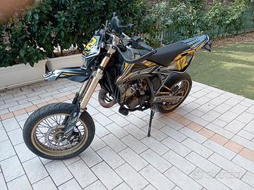 Supermotard 2 tempi con estetica aggiornata e lavori eseguiti di recente.