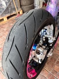 Monta cerchi kite mozzo anodizzato, bicolore adesivo, gomme al 90%; impianto frenante accossato completo e pastiglie carboceramiche anteriori e posteriori.