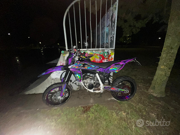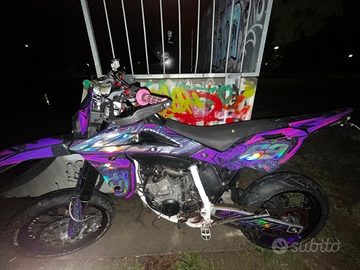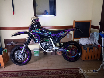 Mono sachs irrigidito, e forcelle di un husqvarna 250 tarate rigide motard, con disco anteriore 320mm a Margherita con sposta pinza moto master, impianto frenante completo brembo e posteriore maggiorato. Scarico completo giannelli con terminale in carbonio