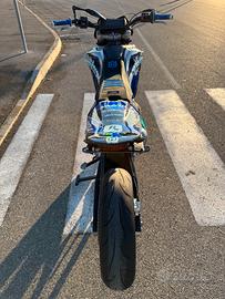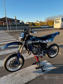 Vendo husqvarna sm/wre 125 2010. Moto rifatta da zero!!!_ rifacimento motore tra cui, cuscinetti di banco biella e pistone_ cuscinetti del cambio, e sostituzione di tutte e 3 le forchette del cambio._ cambiato anche il cuscinetto del contralbero.Dispongono la fattura del meccanico tutto dimostrabile._ carburatore keihin 38 _ pacco lamellare vforce4R_ collettore alluminio presi nuovi da htm nell'ottobre 2024_ sostituito mono originale con uno regolabile del husqvarna 510. Revisionato e tarato motard da preparatore"zuccosospension"_ Forcelle revisionate sempre da zucco._disco 320 a Margherita personalizzato nuovo, più sposta pinza._ Disco posteriore a Margherita nuovo_Pastiglie anteriori e posteriori nuove, più cambio olio di entrambi i freni._ Revisione completa del leveraggio, cambiato tutte le gabbiette a rulli e ingrassate, ovviamente tutto dimostrabile con foto che posso mandare in privato_ cambiato le 4 gabbiette a rulli del forcellone. tutto dimostrabile._ Verniciati forcellone e telaietto di nero lucido da carrozziere._Gomme mitas e cameradarie michelinn _ rapporti 13-47_ Kit plastiche completo preso da bottega del rider_ Kit grafiche full olografiche personalizzate 100% fatte da quagliata_graphics_ sella in alcantara più ricami e inserti forgiati fatta da dripstreet._ Pedane anodizzate blu_ tubi radiatori siliconici blu_ freccie led e faretto led_cambiato relè per freccie a led_ vface comprata nuova da 24mx_ Pedalina cambio twenty_Manopole, paracolpi, viti e rondelle nuove_ lana di roccia al silenziatore, più altre cose che sicuramente sto dimenticando. La moto al momento ha 170 ore totali dal rifacimento del motore A 60 ore ho fatto tutto il resto sospensioni, mono, leveraggio, forcellone, entrambi i dischi e l'estetica. Usata soltanto 8 mesi in 2 anni!!. Tagliandi ogni 15 ore. La moto è in perfette condizioni. Revisione valida fino ad aprile 2027. Cedo cerchi enduro più due scatoli di ricambi. Prezzo 5000? leggermente trattabile.