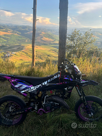 Motore rigenerato con 20h di utilizzo, blocco CR 5T, biella ed albero Prox Japan, carburatore PWK 36, collettore in alluminio, no miscelatore, espansione Scalvini con scarico SP Project, pacco lamellare V Force 4R, accensione PVL, valvola meccanica CR, forcelle Marzocchi, luci led. Regalo anche i pezzi di ricambio, plastiche varie, contachilometri e scarico HGS.