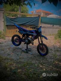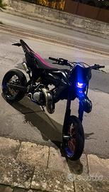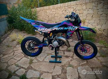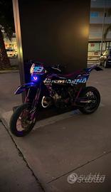 Vendo a malincuore il mio husqvarna sm 125 2t 2008 (restaurato) per passaggio a cilindrata superiore! Motore: - cilindro husqvarna wr 7 travasi -valvola controllata e regolata da pochissimo -pancia fmf fatty gold series per husqvarna cr -terminale messico shorty -corona da 58 denti in ergal blu, catena e pignone da 14 appena montati. -in estate è stato aperto il carter frizione per dare una controllata e sono stati sostituiti diversi ingranaggi con altri nuovi. Ciclistica: -monta gomme pirelli diablo rosso III ancora in buonissime condizioni -è stato fatta la revisione dell'impianto frenante e cambio pastiglie + pompa posteriore nuova -sono stati cambiati recentemente anche la bobina e la candela. Estetica: -grafiche olografiche realizzate da gt stickers - v-face e angel eye rgb di 3dfactory -cerchi bicolor -coprisella artigianale made by wdracing -manubrio viola in ergal -parafango yz 85, leve nuove, cavalletto nuovo, specchietti a manubrio, frecce microled e tanti altri componenti... -inoltre monta un kit completo di plastiche full black e fianchetti bombati derivanti da husqvarna smr 450rr la moto attualmente è in uso e ha circa 31.000 km complessivi (il cilindro nuovo è stato messo circa ai 15k). assieme ad essa cedo alcuni pezzi originali, come le plastiche, le pedane del passeggero... Contattatemi pure qui su subito, o eventualmente al numero 3518977265!