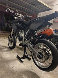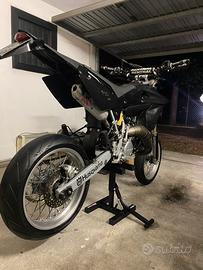 Husqvarna sm 125 del 2008. Plastiche originali colore nero, v face nera, manubrio racing nero con paracolpi RENTHAL, paramani motard, leve cnc alluminio anodizzato grigio, cilindro NUOVO 7 TRAVASI, pistone grafitato monofacsica NUOVO VERTEX, carburatore maggiorato 30 PHBH DELL’ORTO con aria manuale ( rimosso il miscelatore automatico con carburatore elettronico), testa ribassata, scarico COMPLETO SCALVINI (pancia + terminale), cerchi e impianto frenante ( BREMBO )originali, posizione della centralina modificata (sotto codino con scatola apposita) rispetto a quella originale, tamponi 3D su ruota posteriore e manubrio. Moto perfettamente funzionante e tenuta sempre in un ambiente chiuso e coperto, per qualsiasi info resto a disposizione.
