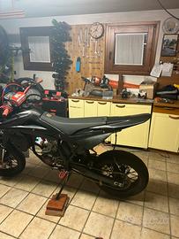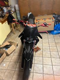 Aggiorneró le foto a moto finita. Vendo Husqvarna SM 125. La moto è stata revisionata con oltre 600€ di lavori appena eseguiti (documentabili tramite ordini e fatture). Meccanica e Motore • Gruppo Termico: Cilindro CR 7 travasi con testa CR (codici verificabili). Appena ricromato, saldato e con traversino raggiato. (misura 54,00) • Pistone: Wossner grafitato (Selezione A) nuovo, 0 ore. (misura 53,95) • Alimentazione: Carburatore Keihin 38 (spillo NOZH) e pacco lamellare Cesare Pasinetti e collettore honda cr. • Conversione Valvola: Passaggio da valvola elettronica a valvola meccanica per una risposta più lineare e affidabile. • Scarico: Pancia CRD con silenziatore dedicato (pezzo raro fuori produzione, valore 300€). • Manutenzione: Basamento con 150h totali; cambi olio regolarmente eseguiti ogni 25/30h. Filtro aria nuovo appena ingrassato. Ciclistica ed Estetica • Sospensioni: Mono derivazione Husqvarna 610; incluse nel prezzo forcelle revisionate 2000km fa. • Freni: Pompa freno, tubo e comando frizione (con cavo) nuovi. • Look: Fianchetti bombati 450RR, parafango YZ85 nuovo, codino WR/CR nuovo, paracolpi renthal, frecce microled, killswitch, manopole rosse, pedane rosse e portatarga estraibile. • Dettagli: Telaietto e forcellone verniciati, tubi radiatore GPI rossi, manubrio e copriviti rossi. Accessori e Ricambi Inclusi Cedo insieme alla moto un ampio pacchetto di parti: • Kit cerchi Enduro completi. kit guarnizioni • Spostapinza custom per disco da 320mm (per upgrade impianto frenante). • Corone di varie dentature, filtri di ricambio e minuteria varia. • 1L di olio motore per il prossimo cambio. Note: La moto verrà utilizzata per il rodaggio, quindi le ore potrebbero variare leggermente. Presenta piccoli difetti estetici, ma meccanicamente è perfetta, pronta all'uso e molto divertente. Omologata motard e 2 posti a libretto. Valuto scambi con 125 2t targati di mio gradimento (posso aggiungere soldi) Prezzo trattabile, accetto caparre.