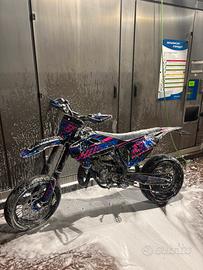 Impianto di scarico completo JSV,disco 320mm con relativo sposta pinza,leve in ergal,pedane blu,leva cambio e pedale freno blu,paramani,riser manubrio blu,manubrio protaper blu,svariate viti ergal/titanio vero acquistate su "ProBolt",dadi in ergal vari,copri accensione coperchio valvola e slider pedane in 3d (non presenti in foto),sella wob design,grafiche full glitter,cerchi bicolor,portatarga pieghevole,tamponi ruota posteriore,parafango hsq fs450 graficato (ho anche quello originale nero e bianco),tabella portanumero graficata dei modelli 2024 (ho anche quella originale bianca e nera)ecc.