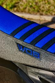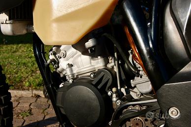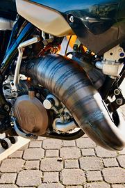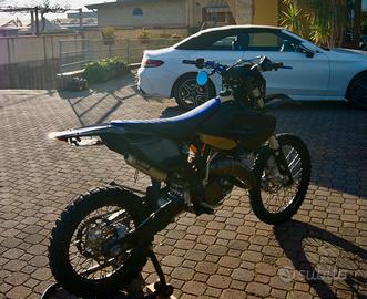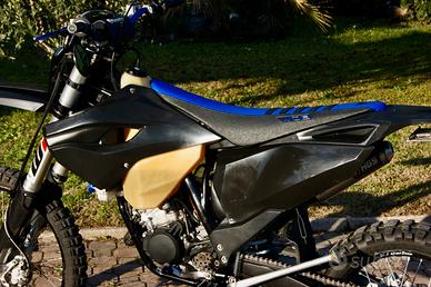 Vendo splendida Husqvarna te 125 del 2014, la moto si presenta in stato eccellente, sempre tenuta in garage, lavata periodicamente e tagliandata ogni 15 ore assieme alla pulizia del filtro dell'aria, motore interamente rifatto 104 ore fa, dischi frizione nuovi, cestello frizione nuovo, pompa freno anteriore appena revisionata, monta espansione scalvini seminuova (vengono cedute due espansioni originali in caso di revisione), silenziatore hgs, telaio riverniciato nero, plastiche nere, faro a led e parafango derivato ktm, copri sella personalizzato wob appena messo, specchietto basso, copriforcelloni neri polisport e leve in ergal blu, manubrio in acciaio anodizzato blu, porta targa pieghevole e gomme in ottime condizioni.