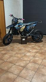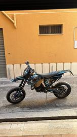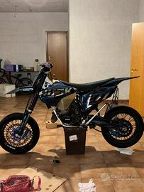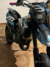 la moto possiede una stravagante quantità di parti in ergal tra cui le pinze, i mozzi, raggi rinforzati, coperchi su manubrio freno e frizione leve del cambio poco piegate a causa della caduta da fermo dovuta al cavalletto un po alto per il motard, tra cui anche la pancia poco bozzata nella parte inferiore ma non causa un problema delle prestazioni. La moto è sempre stata prestante e reattiva. Pistone bifascia cambiato alle 212h e (RIFFATO NUOVO IL BLOCCO MOTORE CON 10 ORE DI UTILIZZO TOTALI DA ADESSO). Raffreddamento a liquido senza miscelatore, batteria compresa ma molti dei quali come indicatore di direzione e specchietti non vengono inclusi dato che l'abbiamo acquistata così. Omologata per 1 sola persona e non ha mai avuto grossi problemi riguardo alla manutenzione. Per ulteriori informazioni in chat, non ci tengo a vendere immediatamente, no affaristi o perditempo, non valuto offerte e non tratto di tanto il prezzo. Sono molto legato alla moto dato che fu la mia prima e unica che mi ha accompagnato in questa passione e valuto soprattutto il futuro proprietario che ne entrerà in possesso con la stessa.