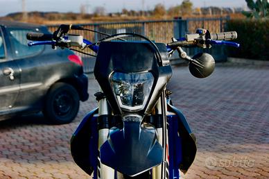 Vendo splendida Husqvarna te 125 del 2014, la moto si presenta in stato eccellente, sempre tenuta in garage, lavata periodicamente e tagliandata ogni 15 ore assieme alla pulizia del filtro dell'aria, motore interamente rifatto 104 ore fa, dischi frizione nuovi, cestello frizione nuovo, pompa freno anteriore appena revisionata, monta espansione scalvini seminuova (vengono cedute due espansioni originali in caso di revisione), silenziatore hgs, telaio riverniciato nero, plastiche nere, faro a led e parafango derivato ktm, copri sella personalizzato wob appena messo, specchietto basso, copriforcelloni neri polisport e leve in ergal blu, manubrio in acciaio anodizzato blu, porta targa pieghevole e gomme in ottime condizioni.