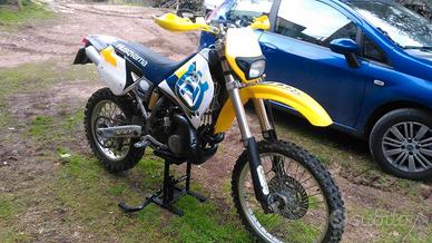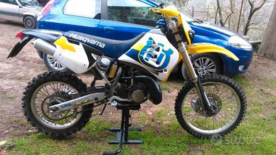 Husqvarna Wr 360 modello anno 99, motore revisionato nel 2014 e da allora usata pochissimo. Sella rifatta. La moto è priva di devio luci, clacson e strumentazione; faro anabbagliante funzionante, impianto elettrico modificato dal primo proprietario, collegamenti da ripristinare se si vuole montare gli accessori mancanti.