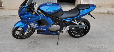 Vendo a malincuore hyosung gt125r per mancanza di utilizzo, la moto è stata tagliandata, sono state aggiunte le frecce a led con relativo cablaggio elettrico per farle funzionare, infine è stata wrappata come si vede dalle foto con un blu notte metallizzato con parti in carbonio lucido,il colore base è il nero.