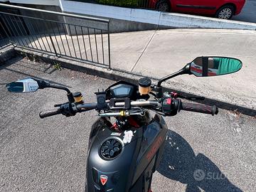 Hypermotard 1100S km 25900 del 2008, full carbon, pluriaccessoriata, regolarmente tagliandata da concessionario Ducati (cambio cinghia, sostituzione olio forcelle, registrazione gioco valvole < 1000km). Unico proprietario. Di seguito la lista degli accessori (con il prezzo degli stessi da nuovi, giusto per capire che ci si porta a casa 7000 euro di accessori). Telaio -Telaietto posteriore alluminio DM Telai (350) -Frizione antisaltellamento STM completa con dischi nuovi, costati 220 euro, sostituiti da < 1000km (900) -Attuatore maggiorato STM (170) -Ammortizzatore di sterzo lineare Ohlins + staffa a manubrio (350) -Pedane ergal racing pluriregolabili AEM Factory (310) Trasmissione -Trasmissione scomponibile AEM Factory (portacorona in magnesio, corona ergal 41 denti passo 520, flangia portacorona in ergal viteria in titanio) (corona e pignone sostituiti da < 500km) (380) -Catena DID ERV 3 oro (sostituita da < 1000km) (130) Terminale Scarico singolo completo in titanio Zard omologato (1700) Centralina dedicata (250) Filtro aria racing K&N, includo kit di pulizia (80) Estetica Kit parafango, paracatena, parapignone (225), carene (430) e becco in carbonio (180) Aviacompositi Codone Aviacompositi con faro integrato e portatarga in carbonio (300) Carter frizione STM (100 ) Specchi con frecce integrate DP (150) Frecce slim DP (100) Serbatoio olio freno e frizione in titanio AEM Factory (da montare) (130) Leve regolabili Pazzoracing (90) Sella racing DP (180) Tappo serbatorio carburante alluminio (120) Altro Batteria Litio Skyrich (800 grammi) (120) Pastiglie freno anteriori ZCOO (sostituite < 1000km) Le modifiche sopra descritte determinano un risparmio di peso superiore ai 20kg. ATTENZIONE: Presente TUTTA la componentistica originale accuratamente imballata (paramani con specchi, scarico, pedane, carene complete, codino etc etc). Questo vuol dire che, volendo ripristinarla completamente originale, c'è tutto quello che serve.