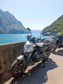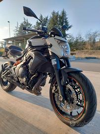 Vendo a malincuore la mia prima moto. Kawasaki ER-6N del 2016, versione con ABS. Poco meno di 30.000km, sono il terzo proprietario (presa nel 2023 a 17.000km). Colorazione bianco/nera con dettagli arancioni, priva di scritte e simboli tranne adesivo con logo kawasaki racing sul parafango anteriore. Nelle foto vedete degli adesivi sulle plastiche della forcella ma gli ho rimossi. Ottima come prima moto, piccola e agile anche nel traffico. Ottima coppia ai bassi regimi con un'erogazione morbida, facilissima da gestire ma sa spingere bene nelle accelerate. Frecce led barracuda Portatarga barracuda Scarico SC Project Oval Insieme vendo borsa da serbatoio e rullo per fare manutenzione alla catena da soli. Sostituita batteria e regolatore di tensione nel 2025 Gomme Pirelli Diablo Rosso III ancora in buone condizioni Sostituite candele nel 2024 Sostituito kit trasmissione a 18kkm. La moto ha qualche segno dovuti a cadute da fermo (carter, maniglie) e in generale di utilizzo intensivo, ma non ha nessun problema e gira come un orologio svizzero. Vendo per passaggio a moto di segmento superiore.