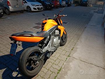 Vendo come da titolo Kawasaki ER6N del 2007 con 16000km. Presenta alcune imperfezioni estetiche riportate in foto, tagliandata ogni anno e monta filtro BMC, terminale GPR omologato, manubrio a piega bassa della rizoma, specchietti barracuda e portatarga e frecce sostituite. Dispongo di tutti i ricambi originali ed insieme alla moto cedo borse laterali GIVI con telaietto dedicato e bauletto con piastra. Vendo per passaggio a tipologia differente, tagliando appena eseguito quindi non necessita di nulla. Prezzo leggermente trattabile, se interessati chiamare dopo le 17.