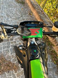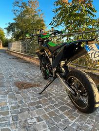 Come si vede dalle foto, vendo una Kawasaki KLX450R del 2008, depotenziata a libretto per A2, doppia omologazione enduro/motard. Omologata per due persone. Sempre tenuta in garage sopra al cavalletto, usata per qualche uscita domenicale, poco più. Attualmente, la moto ha il pistone nuovo appena rodato e monta: