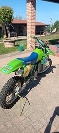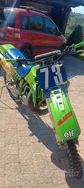 vendo moto cross Kawasaki KX 250 cc 2 tempi anno 1988, usata molto poco ferma da parecchi anni, perfettamente funzionante, con pneumatico posteriore, corona, pignone, catena nuovi, doppie carene, con libretto originale della dogana.