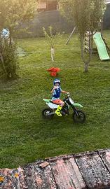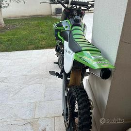 Moto in ottime condizioni, molto potente, non adatta a prima esperienza. 65cc, 17hp, 6 marce, anteriore modificato con forcella a steli rovesciati regolabili da 35mm (originale forcella classica da 32mm non presente) con piastre di sterzo e rialzo manubrio Marzocchi, al posteriore mono ammortizzatore a gas regolabile Showa. Pneumatici seminuovi (oltre 90%) con mousse. Eseguita manutenzione completa ad agosto e non più utilizzata, con sostituzione di tutti i fluidi e pulizia filtro aria, filtro carburante, lavaggio serbatoio e carburatore ad ultrasuoni. Sostituita lana di vetro del silenziatore e petali del pacco lamellare. Moto guidata da ragazzino nei campi adiacenti casa. Mai fatto pista o salti anche dal precedente proprietario. Parafango anteriore strisciato perché si è svitato e mio figlio ci è passato sopra sul vialetto in cemento. Parafango posteriore leggermente sciolto dal calore della marmitta. Motore mai sfruttato in modo gravoso.