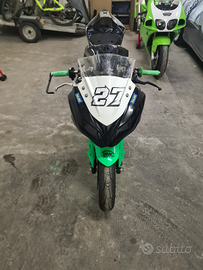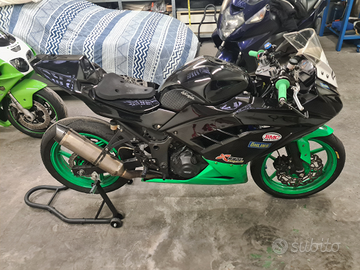 Vendo per passaggio ad altro modello ninja 300 non immatricolata con certificato di conformità (non paga passaggio di proprietà e bollo). La moto monta: cartucce andreani misano, tubi in treccia, disco braking a margherita, cambio elettronico, frizione antisaltellamento, scarico completo arrow, filtro aria bmc pedane arretrate regolabili. La moto è stata usata per allenamento nei kartodromi (non sono un pilota quindi non portata allo sfinimento) è una moto che può girare su tempi che possono impensierire le moto più giovani. Adatta a chi vuole girare con tanto divertimento e poca spesa (costa quanto una mini gp) ma diverte tanto di più. Adatta anche a fare i primi passi con le ruote da 17. Dispongo anche di altri pezzi che vendo a parte o con agiunta di prezzo come centralina rapid bike pompa radiale braking e mono ohlins. SOLO SE REALMENTE INTERESSATI, NO PERDITEMPO, NO AFFARISTI.